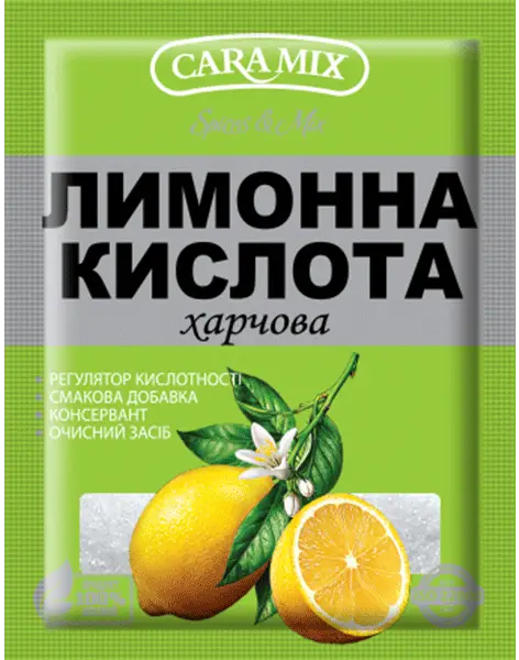 Лимонна кислота активно застосовується в якості смакової добавки, регулятора кислотності та консерванту в харчовій промисловості. Найпопулярніший підкислювач – лимонна кислота, не тільки надає продуктам приємний кислуватий присмак, але й діє як антиокислювач. Застосовується у виробництві багатьох напоїв, кондитерських виробів, желе, джемів, соусів та різноманітних консервів.
