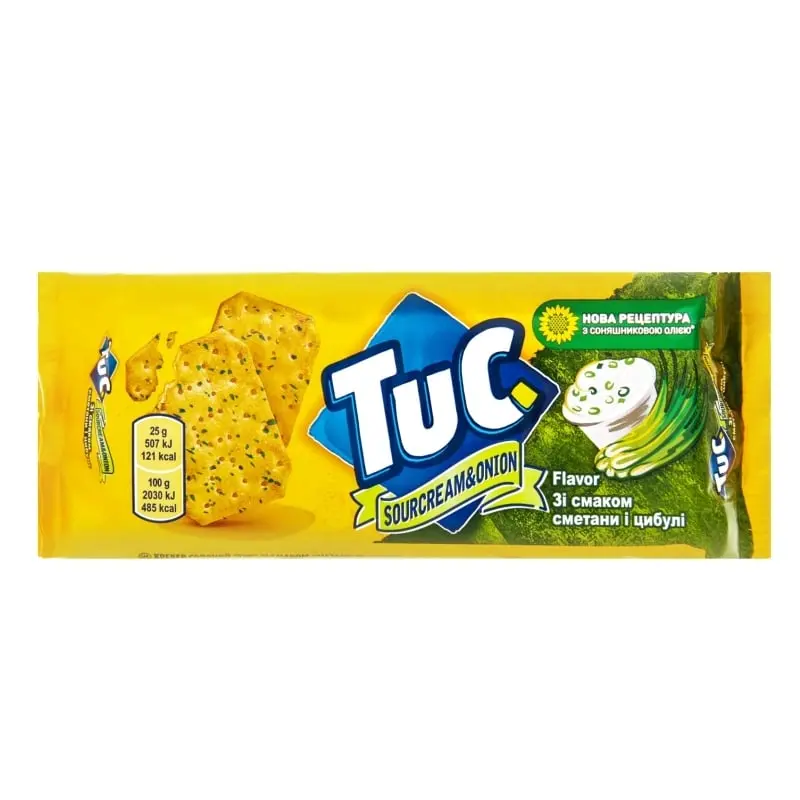 Крекер Tuc Сметана та цибуля – вогонь у кожному шматочку! Насолоджуйтеся хрумким печивом з ароматом пікантної паприки. Ідеальна кількість для задоволення від цього смачного перекушування в будь-який час дня.