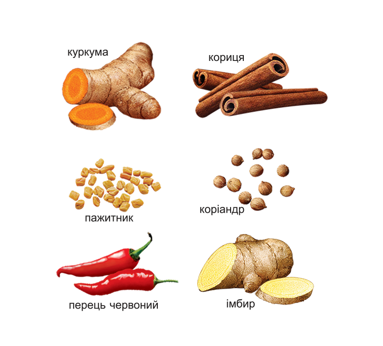 Склад: куркума мелена, корiандр мелений, сiль, пажитник мелений, перець червоний мелений, iмбир мелений, кориця мелена.